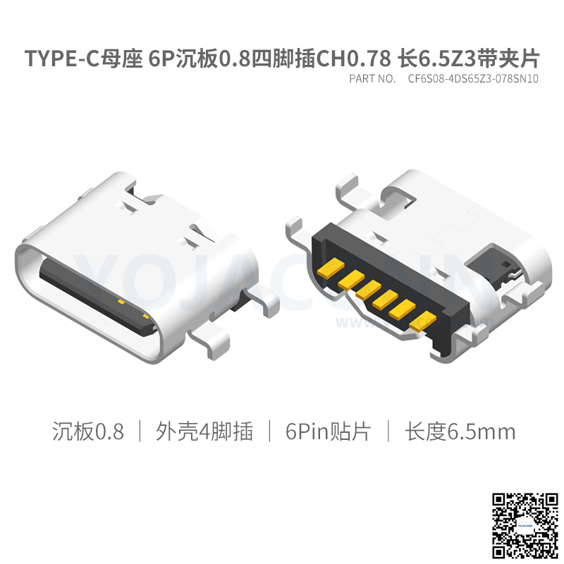 TYPE-C母座 6P沉板0.8四脚插CH0.78 长6.8Z3带夹片