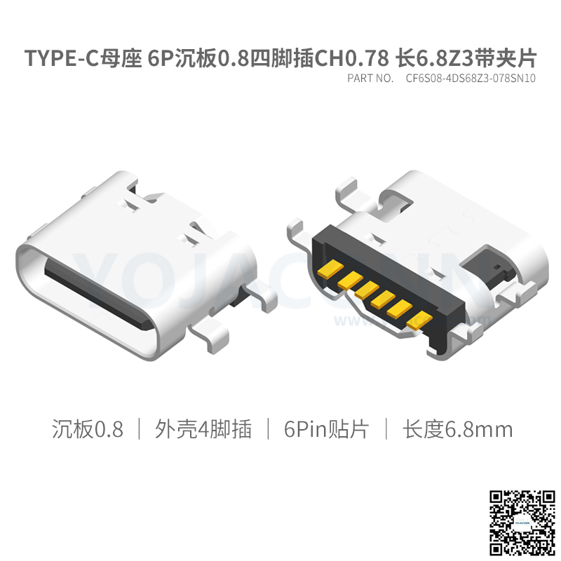 TYPE-C母座 6P沉板0.8四脚插CH0.78 长6.5Z3带夹片